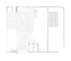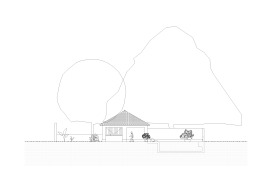 Zur Kompensation der bisherigen Garagennutzung als „Abstellraum“ wurde im vorderen Bereich der Zufahrt ein gedeckter Velostellplatz inkl. Stauraum für Gartengeräte realisiert. Das freigewordene Garagengebäude wurde zu einem offenen, einladenden Gartenhaus mit Küche, Aufenthaltsbereich und einem Lagerschrank umgebaut. Das ursprünglich allseitig verschlossene Garagengebäude wird mit der weiten Öffnung zum Pool zum räumlichen Dreh- und Angelpunkt der Gartenaktivitäten.