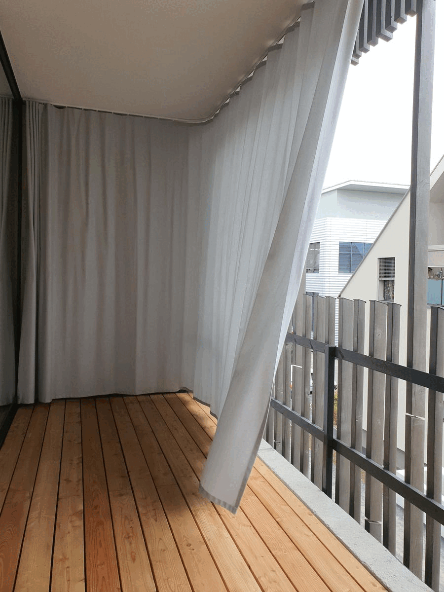 Das Gebäude wurde als hybrider Massivbau geplant und ausgeführt. Die vorgehängte, hinterlüftete und lasierte Holzfassade variiert im Rhythmus unterschiedlicher Profilstärken und Abstände und umfasst das gesamte Gebäude. Die Abstände der Holzlatten vergrössern sich vor allen Fenstern und bilden im Bereich der Loggien die Brüstung. Analog zur Struktur der Holzfassade sind vor den Fenstern Schiebeläden montiert und im Bereich der Loggien helle Vorhänge angebracht.